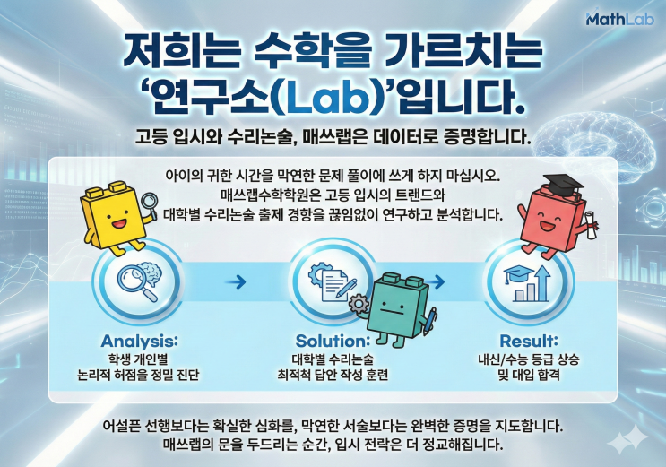 강릉 매쓰랩 수학학원 합격 사례|4등급에서 1등급, 동국대 최종 합격 스토리 강릉수학학원 강릉수학 매쓰랩입니다. 오늘은 20점에서 동국대 합격까지의 스토리로 포스팅을 해볼께요! 매쓰랩이 ‘수학 연구소’인 이유 처음부터 잘하던 아이는 아니었습니다. 중학교 때 수학은 20점대, 고등학교에 올라와서도 4등급에서 좀처럼 벗어나지 못했던 학생. 공부를 안 한 게 아니라 어떻게 해야 하는지 몰랐던 아이였습니다. 막막했던 시작, 그리고 질문 하나 “나는 수학이 안 맞는 걸까?” 성적이 오르지 않으면 아이도, 부모도 가장 먼저 자책하게 됩니다. 하지만 대부분의 경우 문제는 아이의 능력이 아니라 공부 방법과 방향에 있습니다. 매....... <img src="https://blogthumb.pstatic.net/MjAyNjAxMThfODUg/MDAxNzY4NzM4NjcyODcx.n-k6gZcIleX4bWR-4E8yZ0mPfmQSwaiaXO1PCa-aTlAg.89hKXu9KZT5Lck41vryD_eXqS274hsV-hKMU0VGZZLQg.PNG/1768737951506.png?type=s3" />