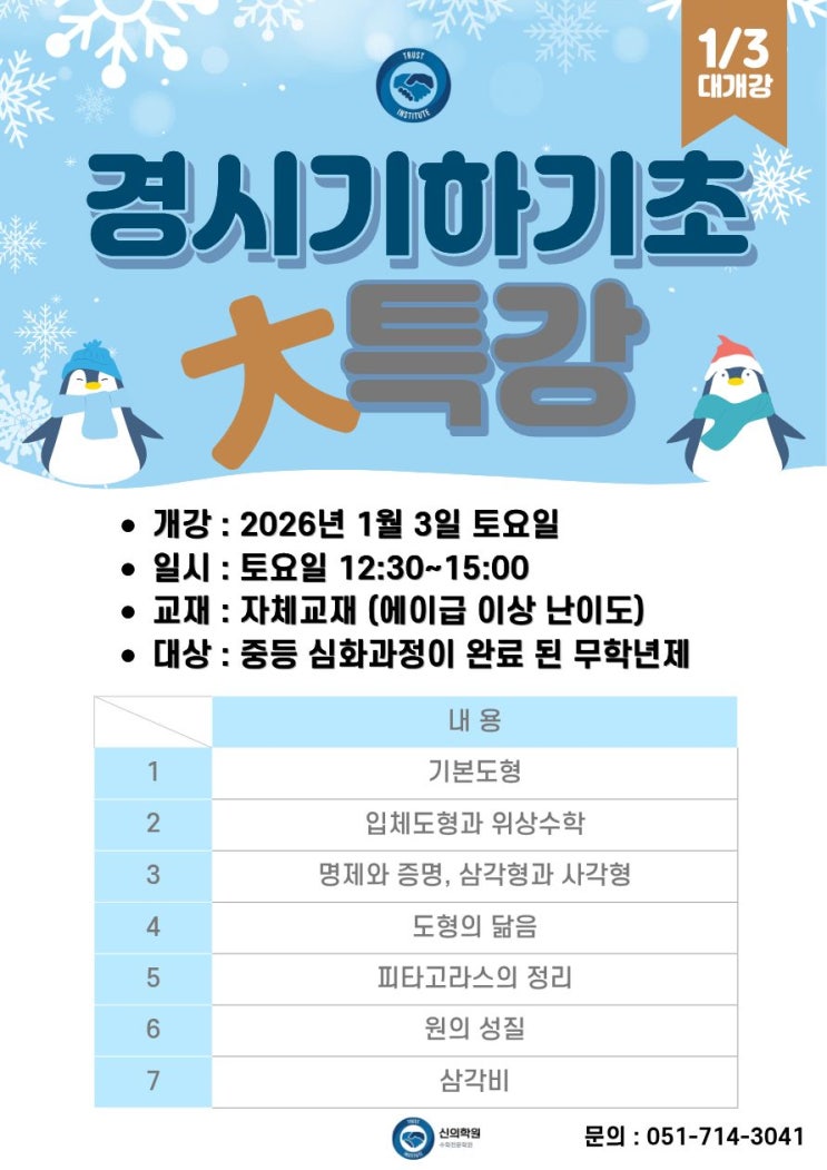 안녕하세요. 과정과 결과로 보답하는 신의학원입니다. 1월에 개강하는 경시기하기초 특강 수업을 안내드립니다. • 과정 : 경시입문기하특강 • 개강 : 2026년 1월 3일(토) • 수업 : 매주 토요일 12:30~15:00 • 교재 : 자체교재 ( 에이급 이상 난이도) • 대상 : 중등 심화과정이 완료 된 무학년제 • 기간 : 5개월 과정 (20주) • 담당 : 서태원선생님 • 내용 : 1. 기본도형 (56쪽, 115문) (1) 기본도형 (2) 작도와 도형의 합동, 다각형 2. 입체도형과 위상수학 (64쪽, 139문) (1) 원과 부채꼴, 활꼴 (2) 공간과 입체도형 (3) 겉넓이와 부피 (4) 도형의 관찰 3. 명제와 증명, 삼각형과 사각형 (71쪽, 144문) (1) 명제와 증명 (2) 삼각형의 성....... <img src="https://blogthumb.pstatic.net/MjAyNTEyMjNfMTEg/MDAxNzY2NDg3MTQ0MTgy.SZqqqorpGHIDIbmvS6KJNvcSvqlF8EP2IUaO43uaWSog.l6c65Q8mkpXFQAzbm1iG5bxRXx9UIBuLHojZ6FRLtEQg.JPEG/%C1%A6%B8%F1%C0%BB_%C0%D4%B7%C2%C7%D8%C1%D6%BC%BC%BF%E4._%281%29.jpg?type=s3" />