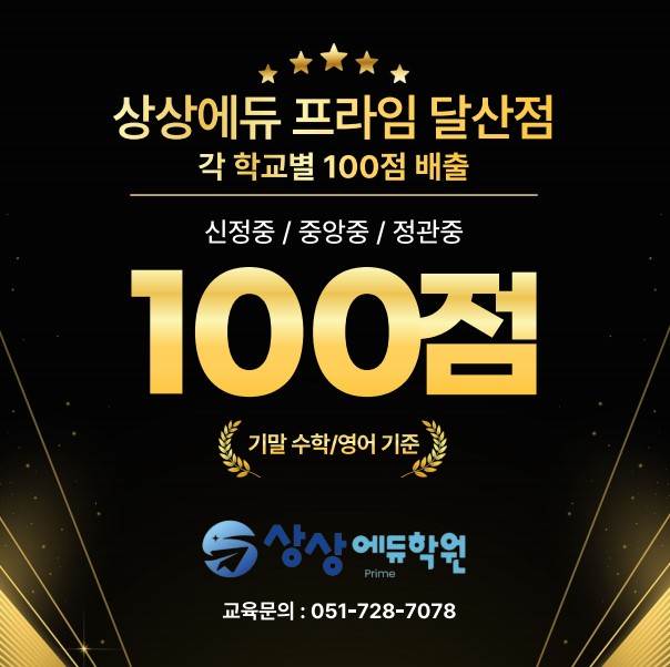 안녕하십니까. 상상에듀 프라임 달산점입니다. 얼마 전 고려대학교 수학 학력평가 대상 배출에 이어 이번 **중등부 기말고사에서도 각 학교별 100점(서술형 포함 만점)**을 배출했습니다. (중앙중 / 신정중 / 정관중) 하지만 더욱 기분 좋은 성과는 ✔ 70점대에서 90점대로 눈에 띄게 성장한 학생들입니다. 주중·주말을 가리지 않고 보충 수업에 성실히 참여하며 끝까지 따라와 준 우리 아이들, 정말 대견하고 자랑스럽습니다. ✔ 상상에듀만의 특별한 노하우가 있을까요? 사실, 저희만의 ‘비법’은 없습니다. 수업 시간에 집중하고, 복습을 성실히 하며, 필요한 문제를 충분히 풀어본 학생이 결국 좋은 결과를 만들어냅니다. 다만, 수업의 방향....... <img src="https://blogthumb.pstatic.net/MjAyNTEyMjNfNTAg/MDAxNzY2NDY2MTE1Nzk2.LgiEimtDloFbiTfZhZjSGSrpF3Tjo0YZu0XggW6SMr8g.cwCCKr9FcpmqmUtbggaABZWVj9jcYU0PqI4_WnKqVaEg.JPEG/%C8%AD%B8%E9_%C4%B8%C3%B3_2025-12-22_163119.jpg?type=s3" />