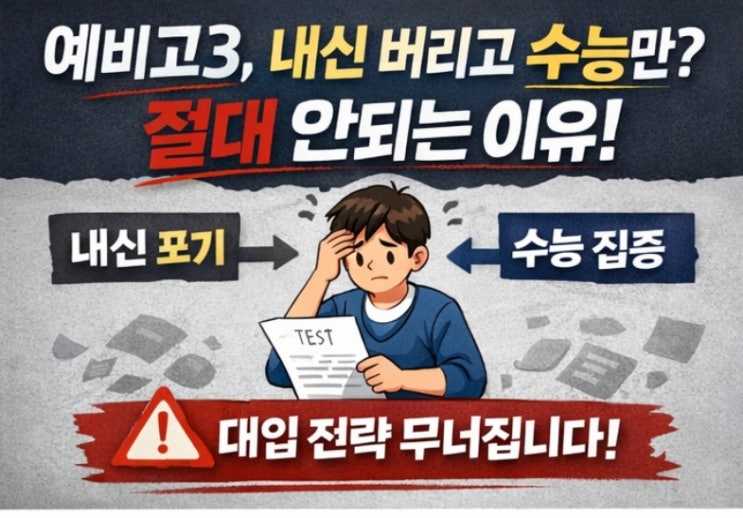 1️⃣ 예비고3, 내신 버리고 수능만? 대구 달서구 고등전문 영어학원이 말리는 이유 2️⃣ 예비고3 내신 포기하면 생기는 치명적인 문제틀 3️⃣ 수능만 집중하면 안 되는 이유 |예비고3 전략, 지금 잘못 잡으면 늦습니다 ❗ 예비고3, 지금 가장 많이 하는 착각 “이제 고3인데 내신은 버리고 수능에만 집중해도 되지 않나요? 대구 달서구에서 고등학생을 지도하다 보면 예비고3 학생·학부모님들이 가장 많이 하는 질문입니다. 하지만 결론부터 말씀드리면 절대 추천하지 않습니다. 이유 ① 내신은 ‘대학 지원 자격’ 그 자체입니다 수능 점수가 아무리 좋아도 내신 등급이 받쳐주지 않으면 지원 자체가 불가능한 대학·전형이 많습니....... <img src="https://blogthumb.pstatic.net/MjAyNTEyMjRfMyAg/MDAxNzY2NTU2NzEzMTg2.tDm25y_JwXWJkEcNWriz9ER0GYpouU3o_pUeom0cbEQg.MvrkVUdCNskl88iMTzU6obdHJPViRfspwpWaVPnNEqQg.JPEG/1766556677259.jpg?type=s3" />