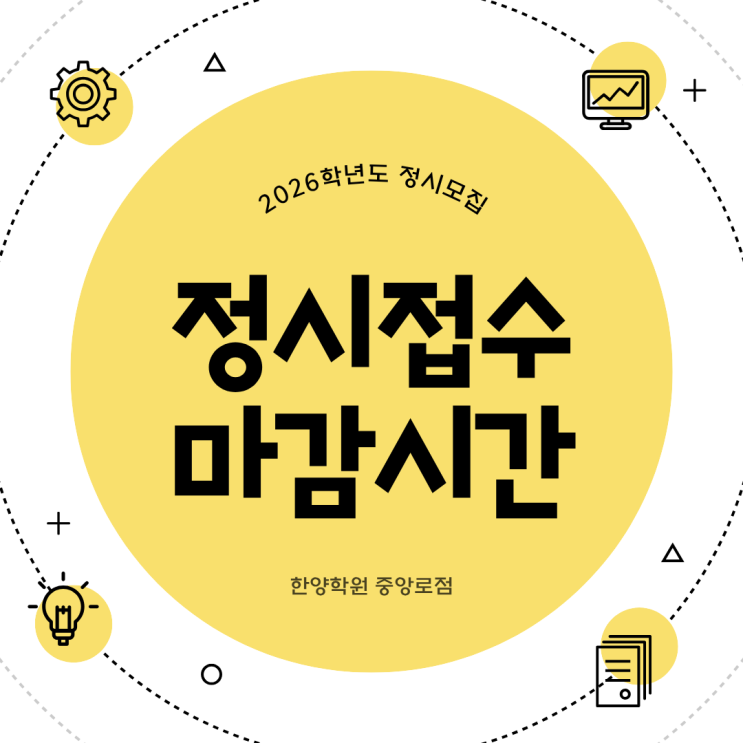 안녕하세요 한양학원 중앙로점입니다. 수험생 분들이 정시지원 시, 무의식적으로 간과하는 사실 중 하나가 무엇인지 다들 알고 있을까요? 바로, 정시 모집 마감시간을 제대로 확인하지 못하여 원서를 제 시간에 접수하지 못하는 실수가 발생하는 것입니다. 따라서 한양학원 중앙로점에서는 수험생 분들의 실수를 미연에 방지하고자 2026학년도 정시모집 원서접수 대학별 마감 시간을 함께 확인하고자 합니다. 올해 정시원서를 접수할 예정인 수험생 분들은 아래의 글을 꼭 끝까지 정독하신 후, 각 대학별 마감 시간을 확인하시어 정시원서 접수 시 실수를 방지하셨으면 좋겠습니다. 그럼, 대학별 정시원서 마감시간을 확인해볼까요? 대학별 정시....... <img src="https://blogthumb.pstatic.net/MjAyNTEyMjRfNzIg/MDAxNzY2NTU4MzY2MTEy.5jdx9DdI4em6LjxL-7SN9WH9qlCzEZW7qPbOh2127LEg.u1NEOdhqMfA-hh6nzY8mkk1bIzYZNegwLYf-upv668cg.PNG/%C1%A6%B8%F1%C0%BB_%C0%D4%B7%C2%C7%D8%C1%D6%BC%BC%BF%E4._%281%29.png?type=s3" />