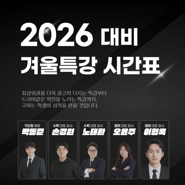 2026년 1월 2월 동안 진행하는 겨울방학 특강 목록 안내드립니다^^ 재원생 뿐만 아니라 비재원생도 참여 가능하오니 이번 겨울동안 들을 수업을 꼼꼼히 검토해주세요! 겨울방학 특강목록 2026 영어특강 1. 중등 문법 총정리 특강 화금 14:00 ~ 16:00 (이형욱T) 2. 고등영어 Penetration 월목 14:00 ~ 16:00 (이형욱T) 3. 수능독해 유형완성 토 15:00 ~ 17:30 (오윤주T) 4. 수능독해 문법완성 토 17:30 ~ 20:00 (오윤주T) ※ 특강 세부내용은 포스팅 하단을 참고바랍니다. 2026 수학특강 1. 손T 추가수업 특강 금 14:00 ~ 16:00 (손경원T) 2. 중2-1 문풀반 월목 14:00 ~ 16:00 (노태환T) 3. 중3-1 문풀반 화금 12:00 ~ 14:00 (노태환T) 4. 중등 수....... <img src="https://blogthumb.pstatic.net/MjAyNTEyMjZfNDgg/MDAxNzY2NzQ2NzE5MDg3.MtcGLPCtDGFDTukEfI1NAldDheflqpGUW4b7bTgYctIg.PPjvM42Eibv0rOlRLEfNfU_07-zKtugXyhlMTO_lxJMg.PNG/2026_%281%29.png?type=s3" />