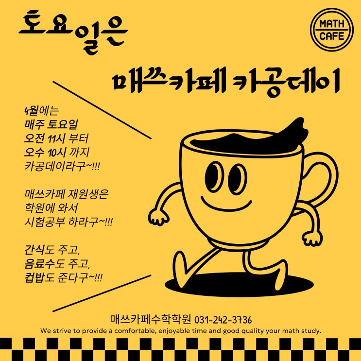 매쓰카페수학학원은 2026년 4월 4일 ~ 4월 25일까지 매주 토요일!! ( 오전11시~오후10시 ) 재학생을 위한 학습공간을 제공합니다. 수학공부는 물론이고 다른 과목도 공부할 수 있어요~! 단, 질문은 수학 문제만...^^;; 그리고 공부하는 학생들의 당충전을 위하여 간식과 음료수가 준비되어 있습니다~! 특히 공부하는 학생들의 식사를 책임져줄 컵밥도 준비되어 있으니 일~찍 와서 늦~게 가세요!! 지금 바로 신청!! 담당 선생님께 문자 또는 카톡 보내주세요:) ********** 주 의 사 항 ********** 1. 입실시간과 퇴실시간을 미리 알려주시고, 시간을 꼭 지켜주세요. 2. 다른 학생들의 공부에 방해가 되는 행동을 하지 않도록 조심하여 주세요. 3. ....... <img src="https://blogthumb.pstatic.net/MjAyNjAzMzFfMjg1/MDAxNzc0OTI3Mzg1Mzc5.XdwZfy3lCzuxRG2iNq8GRLxmdpjhUVJrlYv82EC-By8g.8gWkps7xhH9SfS44UX5fFJZjbPK5enCXErdEcGvx9fIg.JPEG/20260325_%C5%E4%B8%C5%C4%AB009%28%B3%EB%B6%F5%B9%E8%B0%E6%29.jpg?type=s3" />
