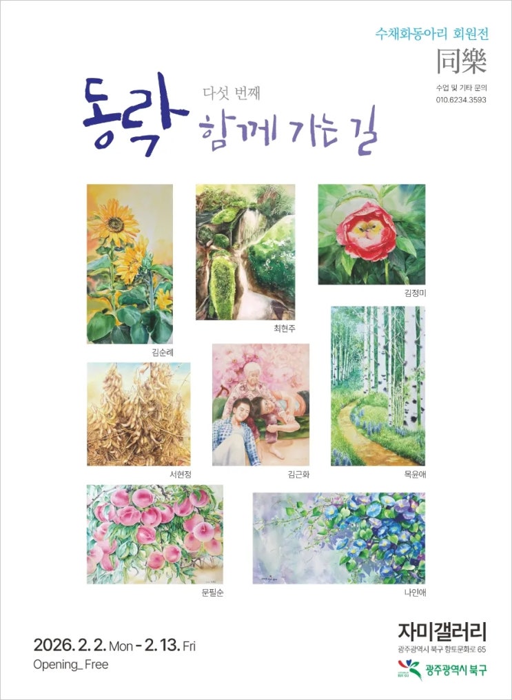 아뜰리에미술 성인취미반 전시회 따스한 붓터치로 담아낸 우리들의 소중한 시간들을 공유하려 합니다. 바쁜 일상 속, 잠시 쉬어가는 마음으로 들러주세요. 무료 관람이니 편하게 오셔서 응원해 주시면 감사하겠습니다! 제5회 동락(同樂) 수채화 회원전 : 함께 가는 길 장소: 자미갤러리 (광주 북구 향토문화로 65) 기간: 2026. 2. 2(월) - 2. 13(금) 관람료: 무료 관람(일요일휴무) 광주 북구평생학습관 1층 자미갤러리 입니다. 내부 외부 #수채화전시회 #동락 #함께가는길 #자미갤러리 #광주전시 #광주무료전시 #광주데이트 #수채화동아리 #전시회추천 #광주북구 #문화생활 #수채화 #그림전시 #취미미술 #용두동성인미술학원 #본촌동성민취미미....... <img src="https://blogthumb.pstatic.net/MjAyNjAyMDFfMjYx/MDAxNzY5OTU1ODMxODA5.JZjVT2zaWjy1CDPFV-Lrh-QzcOrxALru4xptz4LxDmog.NeTsRhnZ3X63nernmJ4GyqRpf5xbYkkmukGMYlJQFFgg.JPEG/900%A3%DF1769673678843.jpg?type=s3" />