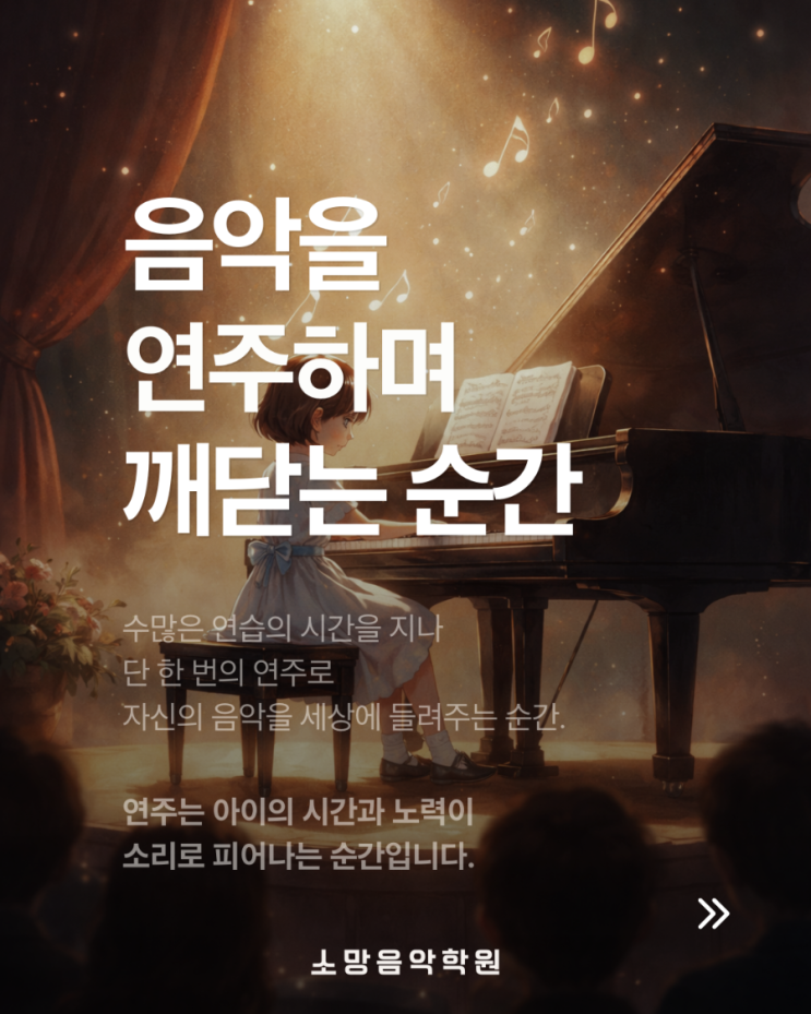 연주는 음악을 배우는 시간이 아니라 자신을 알아가는 시간입니다. 아이들이 피아노를 배우는 시간은 단순히 악보를 읽고 손을 움직이는 시간이 아닙니다. 피아노 앞에 앉아 한 음, 한 음을 만들어 가는 과정 속에서 아이들은 자신과 마주하게 됩니다. 처음에는 어렵게 느껴지던 곡도 조금씩 익숙해지고 어느 순간 자연스럽게 흘러나오는 음악이 됩니다. 그 과정 속에서 아이들은 단순한 연주 기술 이상의 것을 배우게 됩니다. 연주를 하다 보면 실수도 만나고 생각처럼 되지 않는 순간도 있습니다. 하지만 아이들은 그 자리에서 다시 악보를 바라보고 다시 손을 올리며 조금 더 나은 연주를 만들어 갑니다. 이 경험 속에서 아이들은 자연스....... <img src="https://blogthumb.pstatic.net/MjAyNjAzMTJfMjUw/MDAxNzczMzI1MjY4NTU5.7XSOKbffnNXgcSVviA6W2iaxbWmT2o3ZnbtQx91udz8g.Cbg4isVrUQYKGwoIIMoF-aMsAg3l6QMaZ5AiYjZ7OkEg.PNG/900%A3%DF1773160005165.png?type=s3" />