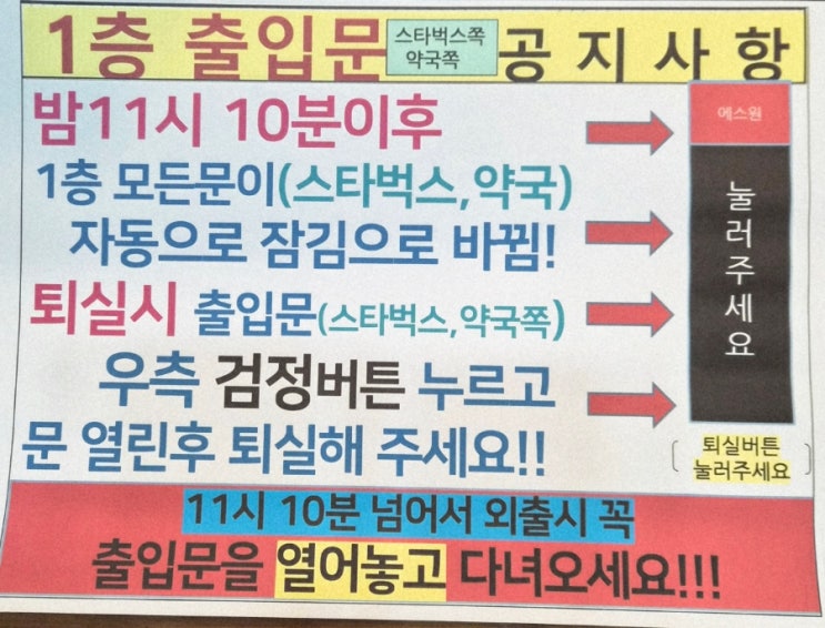 안녕하세요 회원 여러분이 잘 모르시는 부분이 있어서 안내차 블러그를 작성해요~ 이와같이 11시 1ㅇ분이후 1층 관리아저씨가 퇴근(11시30분) 하실때쯤 문이 닫힙니다 그이후에 외출시 스타벅스쪽. 약국쪽 현관문을 열어놓고 외출다녀오시기 바랍니다~ 1층 스타벅스쪽 우측 현관 보시면 검정색으로 눌러주세요가 보일거에요 눌러주시면 "턱" 하는 소리와함께 문이 열립니다 외출시 꼭 문 열어놓고 다녀오세요~~ 스타약국쪽도 마찬가지 문 우측 보시면 보이시죠 ㅎㅎ 힘차게 눌러주세요 다시한번 말씀드리지만 11시 30분 이후 외출시 꼭 문 열어놓고 다녀오세요 감사합니다 공부맛집 아미독서실과 함께 힘차게 신학기 시작해보....... <img src="https://blogthumb.pstatic.net/MjAyNjAzMTJfNCAg/MDAxNzczMzI0ODE0ODkx.NptOQzGZjG3qvwMaHlnkIp2SwimitC8i30HYNOcQOxkg.IjPu6oRuRoSDXcfSddq-dS5JXNhcdPxMzzfbpqCEZwcg.JPEG/900%A3%DF20260312%A3%DF231259.jpg?type=s3" />