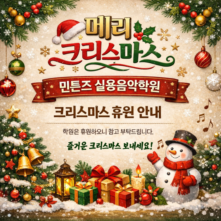 Merry Christmas 민튼즈 실용음악학원을 사랑해주시는 모든 분들께 따뜻하고 행복한 크리스마스가 되길 바랍니다 ✨ 12월 25일(목) 크리스마스 당일은 휴원입니다. 소중한 사람들과 웃음 가득한 하루 보내시고 행복한 연말 되세요 메리 크리스마스! #민튼즈실용음악학원 #민튼즈음악학원 #광산구실용음악학원 #광산구음악학원 #수완지구실용음악학원 #수완지구음악학원 #수완동실용음악학원 #수완동음악학원 #광산구보컬학원 #광산구피아노학원 #광산구기타학원 #광산구드럼학원 #보컬레슨 #피아노레슨 #기타레슨 #드럼레슨 #베이스레슨 #수완초 #수완중 #수완고 #수완하나중 #은빛초 #큰별초 #장덕중 #장덕고 #성덕중 #....... <img src="https://blogthumb.pstatic.net/MjAyNTEyMjRfMTQ4/MDAxNzY2NTU0NjcyMzI2.J8D4PAuQYEQyHVJWg5L9UzxQwB5khJICYOGh7xBybzUg.34eWviCKYjD7Ce7iIkEH2G_M3gbvCZO4ci6LloV0VTgg.PNG/KakaoTalk_20251224_141850788.png?type=s3" />
