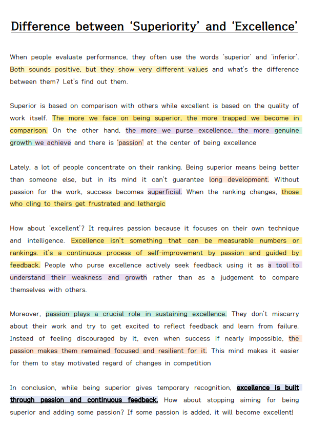 안녕하세요 IMU 입니다 벌써 2월이에요 짧은 2월인만큼 더 꽉꽉 채워 행복하세요 오늘은 본격적으로 저희 아이들 자랑타임 ❤️❤️ [ Reading Master 초고난도 ] 고3 수업때 쓰는 교재인데 주로 정답률 10%~20%대, 고난도 지문들만 다루고있습니다. 최근 수업에서 한 지문인데 건설적인 피드백의 중요성을 이야기하며 'Superiority (우수함)' 과 'Excellence' (훌륭함) 이 2가지 속성의 차이에 대해 설명합니다. ✋️ 잠깐 부연을 곁들이자면 초중고를 모두 다루는 학원의 장점은 단순히 컨텐츠의 확장뿐 아니라 시시각각 변하는 고등 트렌드를 바로바로 캐치하고 초,중등에도 적용시킬 수 있다는 것, 바로 [올....... <img src="https://blogthumb.pstatic.net/MjAyNjAxMjdfMTE3/MDAxNzY5NTE3MDM1NTA5.Pb-ZBtMFqU16dJoOVTzqcZNbVEblnA5dTK5Tuxfqsdcg.J2V_W3LD55wnhgaeGmjPw4DtMxay-P9xNUm7Vg59wNkg.PNG/image.png?type=s3" />