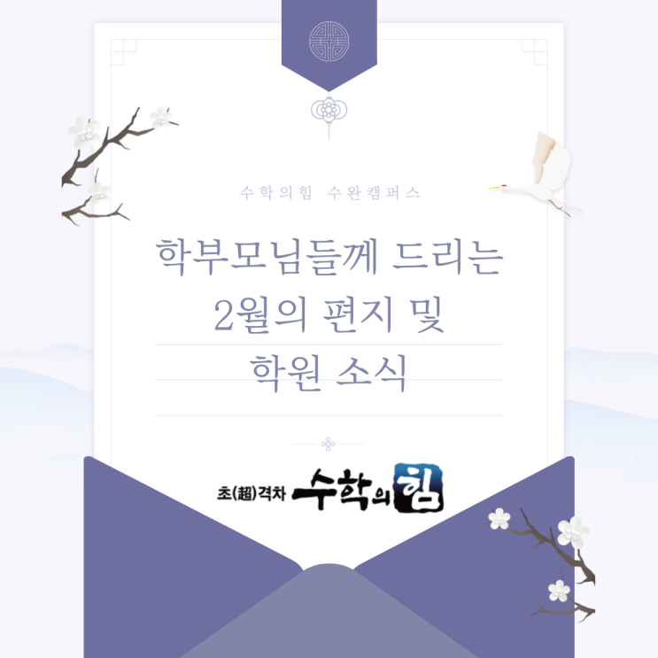 안녕하세요, 학부모님. 수학의힘 원장 김인주입니다. 어느덧 겨울의 끝자락이자 새로운 시작을 준비하는 2월이 되었습니다. 유난히 춥고 길게 느껴졌던 이번 겨울 동안 자녀의 수학 학습을 위해 묵묵히 응원해 주시고 믿고 기다려 주신 학부모님께 진심으로 감사의 인사를 드립니다. 수학은 아이들에게 때로는 넘기 힘든 높은 벽처럼 느껴지기도 합니다. 하지만 이번 겨울방학 동안 우리 아이들은 그 벽을 넘기 위해 매일 차가운 공기를 가르며 학원 문을 열었습니다. 졸린 눈을 비비며 공식을 정리하고, 쉽게 풀리지 않는 문제 앞에서도 펜을 놓지 않았던 아이들의 모습은 그 자체로 이미 값진 성장의 과정이었습니다. 저는 수학에서의 정답 하....... <img src="https://blogthumb.pstatic.net/MjAyNjAyMDNfMjA3/MDAxNzcwMDg0NjQ4ODU3.9dR1LAYGebXCHMqQu3-eIm5h-sB7DvDo06D0pmTsN6wg.29kd_jl-auqUb99vqNQlEznzv5oG5GySctQqAX59P2sg.PNG/2%BF%F9%C0%C7_%C6%ED%C1%F6_2026.png?type=s3" />