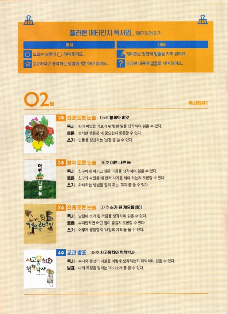 2월 독서캠프1 <초등1학년> 커리큘럼 읽기만 하는 독서는 이제 끝. 생각하며 읽고, 말하고, 쓰는 독서가 시작됩니다 ✍️ 플라톤 메타인지 독서법 ✔ 모르는 낱말은 ○ ✔ 중요하다고 생각한 부분은 ☆ ✔ 궁금한 내용에는 ? ✔ 재미있는 장면엔 밑줄 쫙! 2월 독서캠프1 구성 1주 | 황제와 씨앗 바른 선택이 무엇인지 생각하고, 인물을 칭찬하는 글로 표현해요 2주 | 어떤 나쁜 놈 친구 관계 속 마음을 이해하고 화해의 방법을 글로 써봅니다 3주 | 소가 된 게으름뱅이 성실함의 의미를 토론하고 나의 생활 계획을 글로 정리해요 4주 | 사고뭉치와 착각박사 관계 속 생각을 읽어내고 ?....... <img src="https://blogthumb.pstatic.net/MjAyNjAyMDRfMjQ1/MDAxNzcwMTY5NTc2ODY0.n4mydjg_H5CvlFwwJSI3AE5qldTeeVv4xQVxYOKgx6Ug.0ZtvpfiWTYvfYrSBJlxPT-TJpXPq3fPDTzC6CgGI7fkg.JPEG/900%A3%DF1770169326329.jpg?type=s3" />
