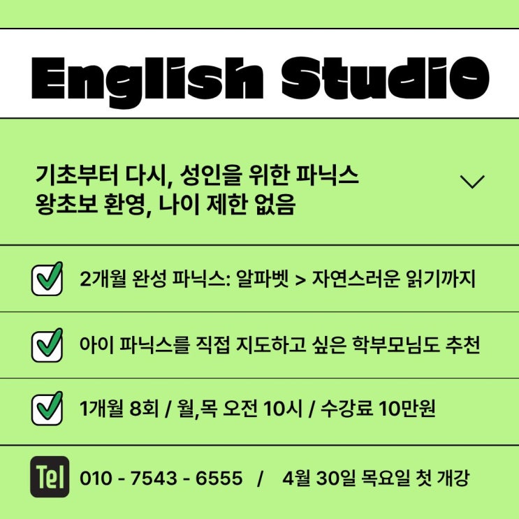 안녕하세요! 공부상점 입니다~ 공부상점 어학원에서 성인 영어반을 개강합니다! 성인들도 영어공부에 늘 목마름이 있죠!! 동영상 강의나 어플로 공부하는 것은 내 의지가 필요합니다! 스스로 시간을 정해두고 꾸준히 하기 어려운 다른 공부 선택지들 보다 분명한 학원의 장점은! 꾸준히 그 과정을 끝낼 수 있는 부분입니다! 새해가 오면 이루고 싶은 목표에 항상 들어있던 영어 공부 이제 진짜 시작해보세요!!! 그리고 제대로된 읽기부터 한 단계씩 성취감을 느껴보세요! 궁금하신 점이 있으시면 편하게 연락 남겨주세요! ☎ 010 7543 6555 <img src="https://blogthumb.pstatic.net/MjAyNjA0MDZfNTMg/MDAxNzc1NDc1Mzk2NDg4.dBmgMQ7Dxi1wMjqsBJ_s0n37UlW09pJYW0AEHDLR8wEg.zxKIcbkFrOj7t18TQ9teuLuOUeQQKui65fZ3jD1VrKwg.JPEG/%BC%BA%C0%CE%BF%B5%BE%EE.jpg?type=s3" />