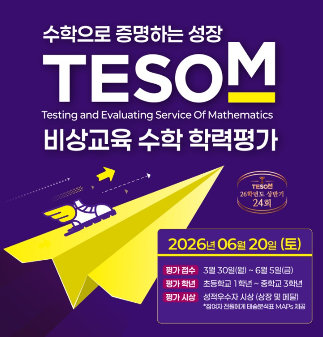 저희 학원에서 TESOM 수학 학력평가를 볼 수 있게 되었습니다. 별도로 고사장 가지않고 저희 학원에서 볼 수 있으니 많은 참여부탁드립니다. 접수도 받고 있습니다. <출제범위> <img src="https://blogthumb.pstatic.net/MjAyNjA0MDdfMTMg/MDAxNzc1NTI5NzM3Njcx.POHrn2p8tnDJetNw1OTRUYN-unL2hehDJ8bl4LT_fMog.PmmhAVRd5azRlHJPCZt37TPlbbvWGtLK1kiYRNqgQXkg.PNG/image.png?type=s3" />