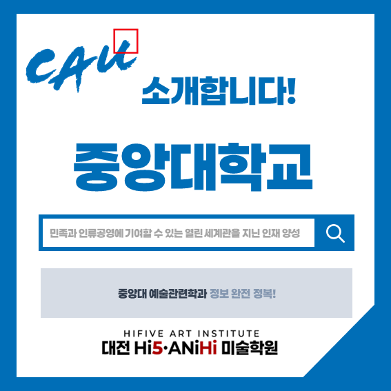 안녕하세요! 대전 하이파이브·애니 하이 미술학원입니다. 지난번 한성대학교 소개에 이어 역사와 전통을 자랑하며 급변하는 사회 정황속에서도 수많은 예술인을 배출하여 우리나라 산업과 예술, 문화계의 현장을 주도하는 중앙대학교(다빈치캠퍼스) 에 대해 소개해드리려합니다~! 중앙대학교의 예술대학, 함께 알아보실까요? 경기도 안성시 대덕면 서동대로 4726 중앙대학교의 미술 관련전공은 예술대학 소속이며 미술학부의 ⭐한국화전공 ⭐서양화전공 ⭐조소전공 글로벌예술학부의 ⭐게임콘텐츠 · 애니메이션 디자인학부의 ⭐공예전공 ⭐산업디자인전공 ⭐시각디자인전공 ⭐실내환경디자인전공 ⭐패션전공 이 있습니다! 미술학부 예술대학 미술....... <img src="https://blogthumb.pstatic.net/MjAyNjA0MDNfMjcg/MDAxNzc1MjE3OTY5NDM5.S6KJ7fqNQ-iXo6gvYSCWfz4GUBIn4ARigmSr0SItD8Eg.WKQ58QnLwJu_lLEopW84URrlP9m6TdOrAFforDVMfZAg.PNG/%C1%DF%BE%D3%B4%EB_.png?type=s3" />
