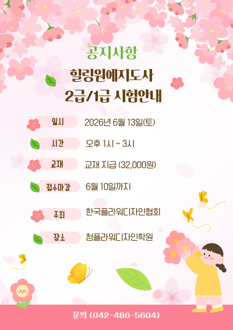 안녕하세요~ 안녕하세요 대전 힐링원예지도사 자격증 전문학원 청플라워디자인학원 입니다. 원예치료지도사에 대해 관심있으신분 계신가요? 아래와 같이 2급시험과 1급시험을 안내합니다. 한국플라워디자인협회에서 주관하는 민간자격증 또는 교재가 필요하신분도 아래에 참고바랍니다. 힐링원예지도사의 자격요건은 '그린인테리어'프로그램과 같은 다양한 원예 교육과정을 통하여 원예에 대한 이론적 기술을 습득합니다. 둘째, 대상자에 대한 이해와 실무경험을 바탕으로 활동계획서, 활동보고서 및 원예평가보고서를 작성할수 있어야 합니다. 세번째, 다양한 원예활동을 기반으로 폭넓은 대상자들에게 꽃과 식물을 활용한 교육을 진....... <img src="https://blogthumb.pstatic.net/MjAyNjAzMjNfNTIg/MDAxNzc0MjM1NzMxNzU5.WKLlmxL4cp0zZ2KWBxn2LspZaizNdFxvHRRyBPYLz24g.KE_r2b0tvIjxSyUc1kaVtw9uoBE57iqzeE4jYwxEE0gg.PNG/%C8%FA%B8%B5%BF%F8%BF%B9.png?type=s3" />