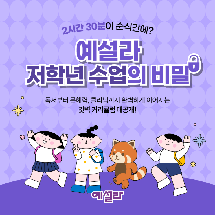 안녕하세요, 초등 국어의 정점 예설라입니다! 예설라는 지난 주 정기평가를 마무리지었어요~ 초등학교에서 중간, 기말 평가가 없어지다보니 시험에 대해 생소했을 우리 아이들, 그런데 정말 깜짝 놀랐어요 공부해왔다고 자랑하는 아이들부터 잘 풀고 오겠다고 파이팅! 하고 가는 친구들까지 걱정보다 더 잘 해내서 다행이라고 생각했습니다 :) 정기평가에 대한 후기는 조만간 들고 올게요! 오늘은 상담 오는 학부모님들이 가장 놀라시는 예설라의 수업시간! 2시간 30분동안 진행되는 수업에 대한 포스팅을 할까 해요 우리 아이는 집중력이 길지 않은데... 가능한가요? 물어보시는 분들을 위해 준비했습니다! 1. 2시간 30분을 채울만큼의 커리큘럼....... <img src="https://blogthumb.pstatic.net/MjAyNjAzMjZfMTQz/MDAxNzc0NTAwNjUzMjM2.nC3lCg_lMLPN41nJqimuIbAfC2VE_5KCuRqM9v-VNHkg.estqwQVIAWJKWEnIHpjr27GcDEbCE0fnCzDGIvlj1cIg.PNG/1p_0.png?type=s3" />