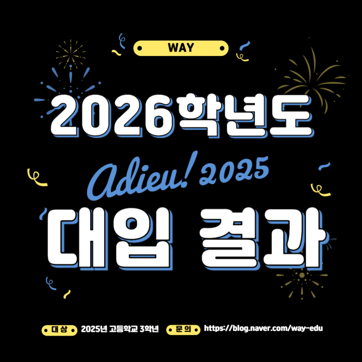 안녕하세요. WAY 학원입니다. 오늘은 길고 험난했던 입시의 여정 속에서 끝까지 완주한 웨이 학원 학생들의 대학 합격 소식을 가져왔습니다. 2026학년도 웨이 학원 고3 학생들의 대학 입시 결과를 알려드릴게요~ 2026학년도 주요 대학 합격 현황 2026학년도 웨이 학원의 대입 결과는요~ 연세대, 한양대, 중앙대, 건국대, 동국대 한국외대, 숭실대, 부산대, 경북대 숙명여대, 서울과기대, 세종대, 명지대, 에리카, 가천대, 경기대, 부경대, 경상 국립대, 영남대, 울산대, 동아대 등을 비롯한 4년제 대학은 물론이고, 과학기술원인 유니스트, 디지스트, 지스트까지! 수많은 합격자들을 배출했습니다. 다시 한번 축하합니다!! 2026학년도 주요 대학....... <img src="https://blogthumb.pstatic.net/MjAyNjAxMjNfMjcg/MDAxNzY5MTU2MjIzNzIz.7c_-5jX76r4A8oNAM3q2XHObv4MCiKLe5PuKShQpVZAg.rxGlbjIHugdHrYqd8zaUOsom3APR20KUDe_Dyqs6eBcg.PNG/%C1%A6%B8%F1%C0%BB_%C0%D4%B7%C2%C7%D8%C1%D6%BC%BC%BF%E4_-001_%284%29.png?type=s3" />