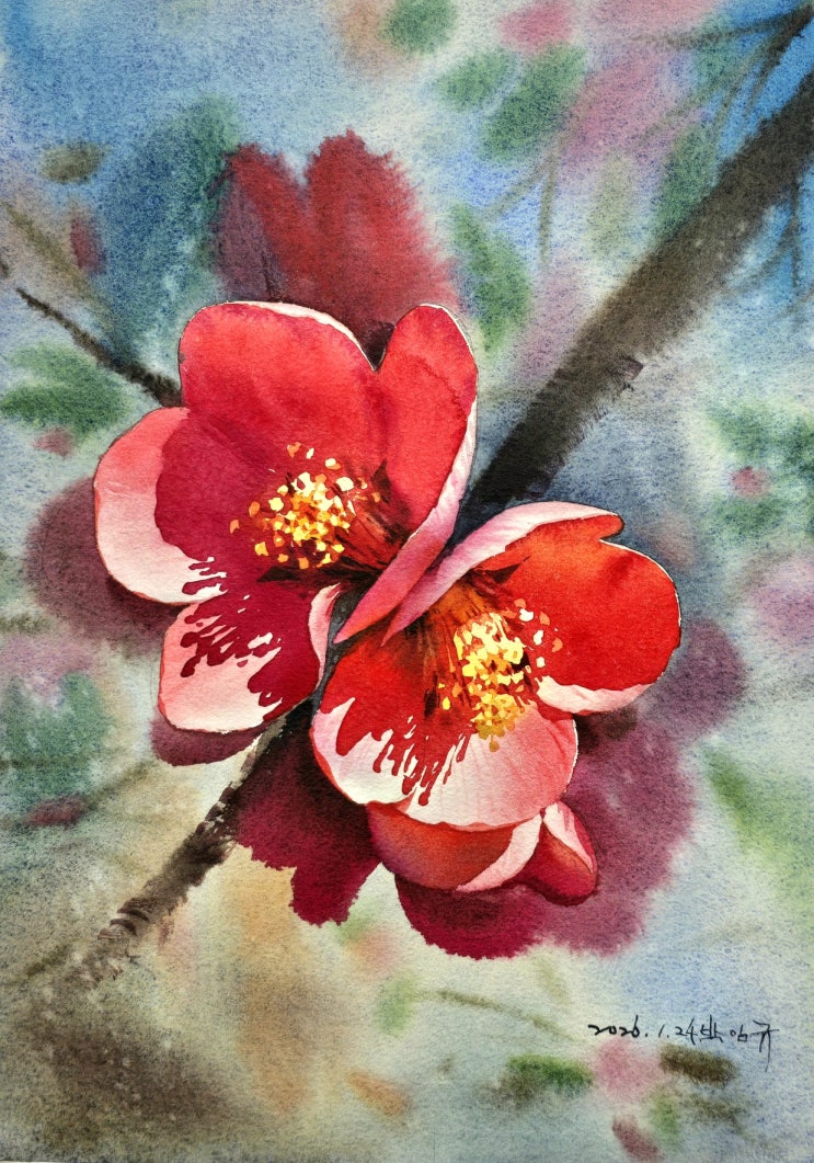 명자꽃 수채화 수업,울산미술학원,울산 성인취미미술,꽃수채화