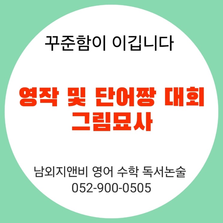 안녕하세요 남외지앤비 영어 수학 독서논술학원입니다. 신학기를 맞이해서 학교 적응과 공부의 힘을 키워야하는 시기입니다. 단어짱 대회 및 영작대회 3월 마지막째주 남외지앤비 영어 수학 독서논술 052-900-0505 <img src="https://blogthumb.pstatic.net/MjAyNjAzMjJfMjEz/MDAxNzc0MTUxNjIwNzM0.Bh61XDoMEKebZT2Q4yREQu31ED5WE2eWRAe1yKcgI8Yg.0EIGzAxZ-UuTT8_ozOTiCKPt1GwEwvbYEvmO-erbCqUg.JPEG/900%A3%DF1774151607416.jpg?type=s3" />