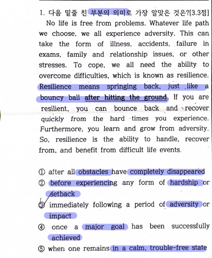 #25년고110모영어 #와이비엠공통영어2 #파퍼씨네펭귄들 #24년고110모영어 안녕하세요! 이 문제는 제시된 영어 지문에서 밑줄 친 부분의 의미를 파악하는 독해 문제입니다. 함께 지문을 분석하고 정답을 찾아가 봅시다. 이 문제를 풀기 위한 핵심 목표는 밑줄 친 문장이 지문 전체의 주제인 **'회복 탄력성(resilience)'**을 어떻게 설명하고 있는지 이해하는 것입니다. • 어법 규칙: 상관 접속사 **'not only A but also B'**는 A와 B가 문법적으로 같은 형태(병렬 구조, Parallelism)를 취해야 합니다. • 분석: 여기서 A는 "survived" (과거 동사)입니다. 따라서 B에 해당하는 동사 역시 과거형이 되어야....... <img src="https://blogthumb.pstatic.net/MjAyNTEyMTNfMjMw/MDAxNzY1NTg1NjU1NTQ5.DUuwXyBXlgL_1nZZhBbhr7AkowqnmeUSioTPusWO9p4g.q4liWkjErsoJ1BraTKr8h1owuJXLGh0KLIvThGYYwX4g.JPEG/IMG%A3%DF2091.jpg?type=s3" />