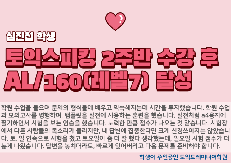 오늘은 토익트레이너에서 지나쌤의 피드백과 성실한 모의고사 참여로 좋은 점수를 얻은 심진섭 학생의 후기를 알아봅시다 (๑•᎑•๑) 1. 첫째주 후기 - 학원 수업을 들으며 문제의 형식들에 배우고 익숙해지는데 시간을 투자했습니다. 2. 둘째주 후기 - 학원 수업과 모의고사를 병행하며, 탬플릿을 실전에 사용하는 훈련을 했습니다. - 실전처럼 a4용지에 필기하면서 시험을 보는 연습을 했습니다. 3. 종강 후 후기 - 평소에 영어 발음은 좋은 편이라 생각했습니다. - 노력한 만큼 점수가 나오는 것 같습니다. - 시험장에서 다른 사람들의 목소리가 들리지만, 내 답변에 집중한다면 크게 신경쓰이지는 않았습니다. 4. 결과 - 토, 일 연속으로 시....... <img src="https://blogthumb.pstatic.net/MjAyNTEyMjNfMTkg/MDAxNzY2NDg2NzAxNTYy.EI3W2UZp9mr-5HJa7OTUxBsPeBg2tSkGIJ8-ePGWtGwg.86l_Qh5ZN-y6cc6qggtf1bSgtdMRgYJS1lJFX2Ju9fUg.PNG/%C1%A6%B8%F1%C0%BB_%C0%D4%B7%C2%C7%D8%C1%D6%BC%BC%BF%E4._%282%29.png?type=s3" />