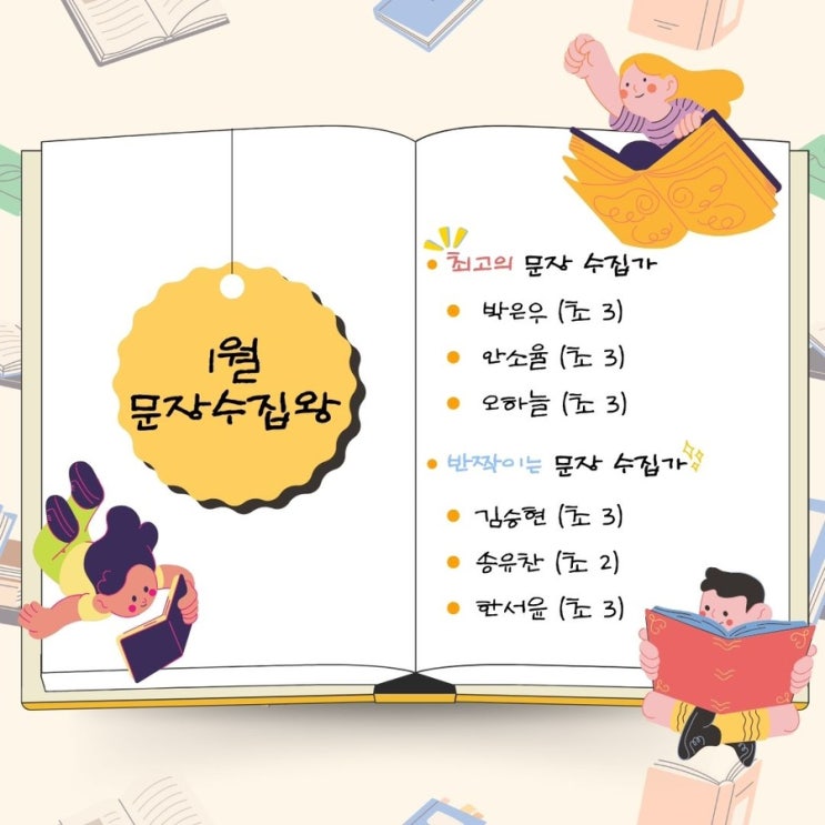 안녕하세요! 독서로 국어를 잇다, 이음쌤입니다. ^^ 새해의 첫 달, 1월이 어느새 마무리되었습니다. 우리 리드인 독서논술 보람학원은 1월부터 책을 읽으며 보석 같은 문장을 찾아내는 <문장 수집가> 프로젝트가 시작되었습니다! 단순히 책을 눈으로만 읽는 것이 아니라, "이 표현 참 멋지다!" "내 마음이랑 딱 맞는 문장이야." 라고 느끼며, 좋은 문장을 스스로 찾아내어 기록하는 훈련입니다. 이 과정이 쌓이면 아이들의 어휘력과 표현력은 놀랍게 성장합니다. 오늘은 1월 한 달간, 그 누구보다 성실하고 빛나는 눈으로 문장을 수집해 준 영광의 주인공들을 소개합니다! 최고의 문장 수집가 (3명) 1월 1주 차부....... <img src="https://blogthumb.pstatic.net/MjAyNjAxMjdfMjAz/MDAxNzY5NTE0MzIxMDk5.WTJEsVLQgwT4ko3UbWrlDRg1vBFxPQj5yVH70jYokGkg.1FeWdftZGdvd0dmHT7sNQoAR9hxM5tkEh_VFxpSEzbMg.JPEG/IMG%A3%DF7611.JPG?type=s3" />