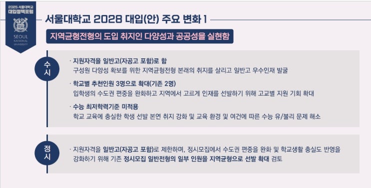 서울대학교 2025년 대입 정책포럼 자료에 따르면, 2028학년도 대학 입시부터 주요 대학 전형이 기존의 수능 중심 선발 방식에서 벗어나 고교 교육 과정과 학교생활, 학생의 학업 역량을 종합적으로 평가하는 방향으로 변화할 예정입니다. 수시 전형에서는 지역균형전형이 확대되고 학교 추천 인원이 늘어나며, 수능 최저학력기준의 영향은 줄어드는 대신 학교생활의 충실도와 교과 학습 과정, 탐구 활동 등이 더욱 중요하게 평가됩니다. 또한 새롭게 도입되는 역량 중심 면접에서는 단순한 지식 확인이 아니라 문제 해결 과정, 사고력, 의사소통 능력, 주도적 학습 경험 등을 중심으로 학생의 실제 역량을 종합적으로 평가하게 됩니다. 정시모집....... <img src="https://blogthumb.pstatic.net/MjAyNjAyMDVfMjQ5/MDAxNzcwMjczMzIwODg4.5vzNZAou7EiH0HCnfpujTCZC6EIPvpXWPIYK1oqAv7Ig.tCGeh82pRtpkR7lWTs6UC4dPmOguCTZ2v_Slak8YM8sg.JPEG/%BC%AD%BF%EF%B4%EB_%C0%D4%BD%C3_%BA%AF%C8%AD1.jpg?type=s3" />