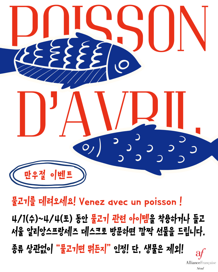 만우절 이벤트 | Poisson d’avril 물고기를 데려오세요! Venez avec un poisson ! 4/1(수)~4/4(토) 동안 물고기 관련 아이템을 착용하거나 들고 서울 알리앙스프랑세즈 데스크로 방문해 주세요. 종류 상관없이 “물고기면 뭐든지” 인정! 단, 생물은 제외❌ 참여해주신 분들께는 깜짝 선물을 드립니다 <img src="https://blogthumb.pstatic.net/MjAyNjAzMzBfMjU4/MDAxNzc0ODMyNjYzMDMz.ztv6iMnp-kWffyDyoUuUXUfrih5unVkIHugaYMuIAcYg.-EAljmoCAZoVPrr8-d5nX3YCRaXUiFiUSQ0SGaHbVgEg.PNG/KakaoTalk_20260330_094852964.png?type=s3" />