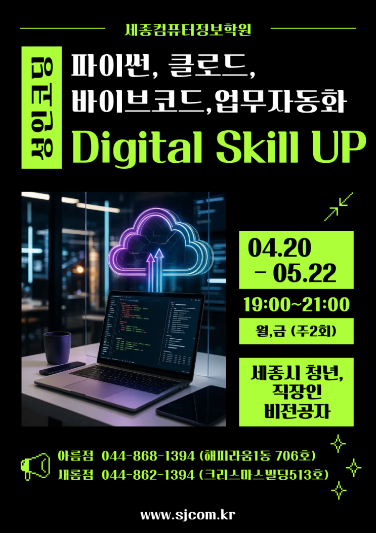 안녕하세요~ 세종시 IT전문교육기관 세종컴퓨터정보학원입니다^^ 2026년, 이제 '일 잘하는 사람'의 기준은 얼마나 많은 시간을 쓰느냐가 아니라, 'AI와 도구를 얼마나 잘 활용하느냐' 에 달려 있습니다. 복잡한 엑셀 작업에 퇴근이 늦어지는 직장인, 취업 경쟁력을 높이고 싶은 청년, 그리고 코딩은 남 일이라고만 생각했던 비전공자분들을 위해 세종컴퓨터정보학원이 특별한 스킬업 클래스를 준비했습니다. 단순히 문법만 배우는 지루한 코딩 수업이 아닙니다. 실무에 즉시 투입 가능한 생존형 기술을 배웁니다. 어렵게만 느껴졌던 파이썬, 실무에 필요한 핵심 기능만 쏙쏙 골라 기초를 다지며, Claude & AI 툴 사용으....... <img src="https://blogthumb.pstatic.net/MjAyNjA0MDFfMTk2/MDAxNzc1MDA5NTQ0NzYz.P6IaGjBWZCJ0hl8QjGUEyifqAWByEyYXBqLrwo7T0KIg.WJxTV6sMrT6ZI6jJ6B5ikt02Yq9V1amgMnm65yFe2Kcg.PNG/%BC%BA%C0%CE%C4%DA%B5%F9_%282%29.png?type=s3" />