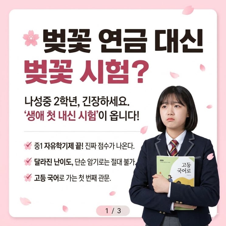 안녕하세요! 어느덧 벚꽃 휘날리는 시험의 계절이 다가오고 있습니다. 특히 우리 나성중 2학년 친구들에게 이번 중간고사는 인생에서 아주 특별한 의미가 있죠. 왜냐고요? "생애 첫 내신 시험"이니까요! 대치학원 새롬캠퍼스 044-715-5116 중2 국어, 왜 이렇게 중요할까? 공부 정체성의 시작: 1학년 때 자유학기제로 시험 없이 지내다가 처음 마주하는 '숫자(점수)'는 아이들의 학습 자신감에 지대한 영향을 줍니다. 문학 vs 비문학의 습격: 중1 때와는 차원이 다른 외부 지문과 낯선 문학 작품들이 쏟아집니다. 단순 암기로는 절대 100점 못 받아요! 고등 국어의 징검다리: 지금 잡지 못하면 고등학교 가서 '국포....... <img src="https://blogthumb.pstatic.net/MjAyNjAzMjdfMTIx/MDAxNzc0NjE0NDA5MTg0.14OEDXbUb6OdziRSL0jvoND3gJVaEQywA8VFC7krvlIg.rQPU4P5Kgy7DaFlzXzTOyc6WR-XcfMYM9zU1tVxXzXUg.JPEG/na1.jpg?type=s3" />
