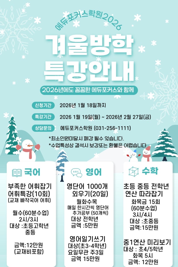 상담문의 : 031-256-1111 #호매실학원 #독서논술 #에듀포커스학원 #능실학원 #능실겨울방학특강 #호매실영수학원 #호매실국어 <img src="https://blogthumb.pstatic.net/MjAyNTEyMjJfMTk2/MDAxNzY2Mzg2NzIyMjk3.qSJWM3cdIE4pQMWt1uN4o-rXMrpnnTQjm-RiXWYTFg0g.ZgTC9MZsMr28OK4YSjtcqeAToCeDISBKxzy_IGy_5-Eg.JPEG/900%A3%DF1766310428476.jpg?type=s3" />