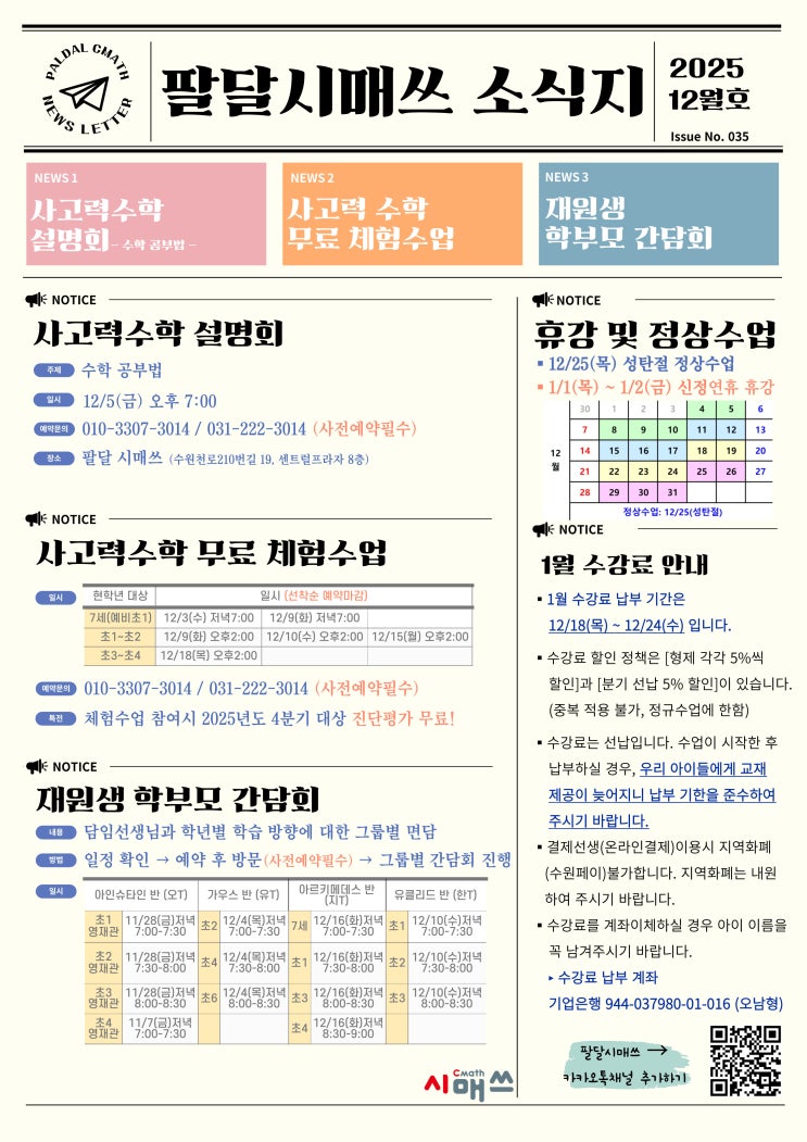 #유아공부, #초등공부, #사고력수학, #연산수학, #교과수학, #수학잘하는법, #수학잘하는아이들, #시매쓰수학, #팔달시매쓰, #시매쓰팔달센터, #인계초등학교, #팔달초등학교, #매교초등학교, #매산초등학교, #지동초등학교, #신곡초등학교, #규장초등학교, #매여울초등학교, #세곡초등학교, #산남초등학교, #남창초등학교 <img src="https://blogthumb.pstatic.net/MjAyNTEyMDhfMTIw/MDAxNzY1MTc1Njg2MTYz.jwsUMGsbKaO5v9RB3HUJz5LDgMX3pQ4iKmafe3A9N_kg.2FYeybyg6yK410qg8fB1HnvjNcbo2QsL1zujSTfndFog.JPEG/KakaoTalk_20251208_114346552.jpg?type=s3" />