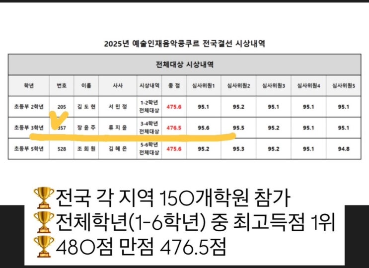 안녕하세요 딜라잇음악학원입니다. 지난 12.20 토요일 서울 총신대학교에서 열린 예술인재음악콩쿠르 전국결선전에 5명의 본원생이 참가하였습니다. 25년도 한 해 준대상이내 수상자들만이 참가하는 대회이며 전국 각 지역 150개학원이 참가하였으며 3학년 68명 4학년 75명 전체 참가인원 200명이상대의 인원이 참가하였습니다. 딜라잇 장윤주(매교초3)학년 학생이 본 대회에서 480점 만점 중 476.5점을 받아 3,4학년부 전체대상 및 전 학년 중 1위 최고득점 을 받았습니다^^ 전국 지역대회 상위입상자만이 참가하는 대회였기 때문에 470점 이상의 점수를 받은 학생들이 많지 않았던 가운데, 박윤우(매교초2) 학생은 2위를 수상했으며(472.7) 김....... <img src="https://blogthumb.pstatic.net/MjAyNTEyMjJfMTA4/MDAxNzY2Mzk3NTI4MDg2.pRbzfvD7Xj11LtKhE-8JfhKVjJTMDgGTXjlRNmM-Omog.0bho1_JswApqhpySf0c7cZhXpvgtlLfgspuXFUk1bkQg.JPEG/64059788%A3%AD6113%A3%AD4263%A3%AD96B2%A3%AD100007E203A8.jpg?type=s3" />