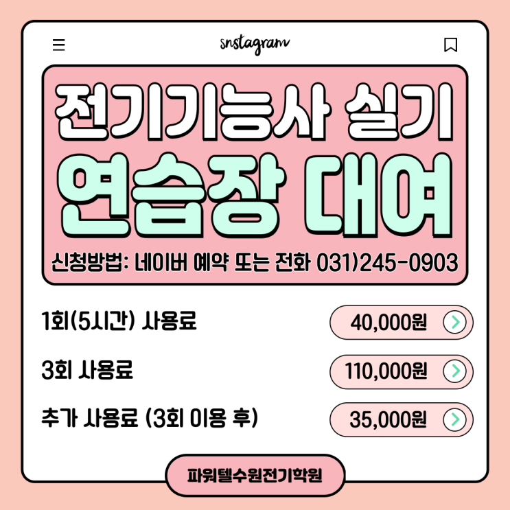 안녕하세요! 파워텔 수원전기학원입니다. 2026년도 제1회 전기기능사 실기시험 대비 연습장(실습장) 대여 안내드리고자 찾아왔습니다! 저희 파워텔 수원전기학원에서는 전기기능사 실기 수업과는 별개로 최신식 실습공간을 대여해 드리고 있는데요! 단순한 공간 대여가 아닌, 동작 체크! 공개도면 출력! 기술사, 기능장 및 경험이 많은 전문 강사진이 항시 대기하여 실습 중 궁금증 해결까지! 여기에 더해 실기시험의 핵심포인트와 실전 팁을 제공해 드립니다!!! 전기기능사 실기 시험을 재도전 하시는 분들께는 정말 최고의 선택이죠! 이론내용이 생각안나신다면, 저희 파워텔 수원전기학원 유튜브와 홈페이지에 올라가 있는 전기기능사 실기 이....... <img src="https://blogthumb.pstatic.net/MjAyNjAyMDZfMjc1/MDAxNzcwMzczNTI5Mzky.RBg9MOvAB2EvBjI0zJUix2rW51_P-WP0gkD2NFV24XMg.NmX6qpt1fg_rKLspu5hBL7y6tLS8E6ae-rxsqamtikAg.PNG/001.png?type=s3" />