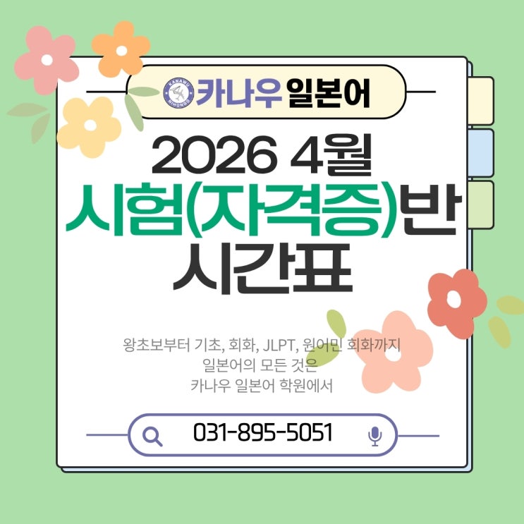 [시험(자격증)반 안내] 일본어공부의 모든 것, 카나우 일본어 학원 26년 4월 시간표 꿈이 이루어지는 곳, [夢がかなう所、かなう日本語] 카나우 일본어 학원은 왕초보부터 기초, 회화, JLPT, 원어민 회화까지 일본어의 모든 것을 가르치는 일본어 전문 학원 입니다 26년 7월 시험 완벽준비! 26년 JLPT 시험의 접수가 성큼 다가왔어요! 여러분은 이번 7월 시험을 어떻게 준비하고 계시나요~? 카나우 원장선생님과의 상담을 통해 나의 현재 레벨을 파악하고 시험까지 남은 기간에 앞으로 어떻게 일본어를 공부해 나가면 좋을지 어떻게 집중을 해야할지! 카나우와 함께 알아봐요 26년 7월 시험대비를 위해 JLPT전문 강사님들과 함께하는 합격 로....... <img src="https://blogthumb.pstatic.net/MjAyNjAzMjZfMTk0/MDAxNzc0NDg1MDAwNDI1.uPvvq5CT5XGrB1x_spiHhAyazdw-ZpPIeIk-ohtFBFEg.l_QAocv5jgtpMzbhbs_hXYkQkpvrlKnVVeba7ioN-gYg.JPEG/%BA%ED%B7%CE%B1%D7_%BD%E6%B3%D7%C0%CF_%281%29.jpg?type=s3" />