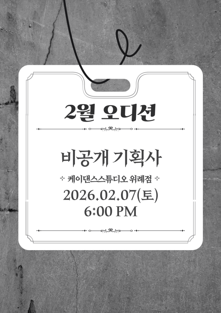 [2월 오디션] 비공개 기획사 내방 오디션 |케이댄스스튜디오 단독 진행 안녕하세요, 케이댄스스튜디오입니다. 이번 2월, 케이댄스스튜디오에서 외부 공개되지 않는 ‘비공개 기획사’ 내방 오디션이 진행됩니다. 온라인 공고, 대형 공개 오디션과는 달리 ✔️ 소수 인원 ✔️ 보다 집중도 높은 심사 ✔️ 현장에서 직접 가능성을 보는 오디션으로, 평소 쉽게 접하기 어려운 실질적인 기회가 될 수 있는 오디션입니다. “한 번쯤은 제대로 된 오디션을 경험해보고 싶다” “내 실력이 어느 정도인지 직접 확인해보고 싶다” “기획사 관계자 앞에서 직접 보여주고 싶다” 는 분들께 특히 추천드립니다. 이번 오디션은 **“비공개 기획사....... <img src="https://blogthumb.pstatic.net/MjAyNjAxMjVfMjI5/MDAxNzY5MzMyNDkzODA1.7oxxOdDtc4LwjJyDU-dmz52ISRGQdD-d7IvnKtMtcl0g.77LYWENO8Yd_FUiiBsBhte7z-bMXAdZNLQsqh9S_heAg.PNG/%BF%C0%B5%F0%BC%C7-017.png?type=s3" />