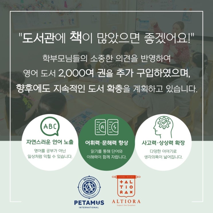 안녕하세요. ALTIORA / PETAMUS입니다. 학부모님들의 도서관에 책이 더 많았으면 좋겠어요! 라는 소중한 의견을 반영하여 영어 도서 2,000여 권을 추가 구입했으며, 앞으로도 지속적인 도서 확충을 이어갈 예정입니다. 책을 많이 갖추는 일은 단순한 ‘양’이 아니라, 아이들이 영어를 자연스럽게 만나는 시간과 기회를 늘려주는 교육 환경 조성입니다. 특히 유아·아동 시기에는 이야기 속에서 반복적으로 언어를 접할 때 영어가 ‘공부’가 아닌 ‘경험’으로 자리 잡습니다. 이번 도서 확충을 통해 기대하는 교육적 효과는 다음과 같습니다. 자연스러운 언어 노출 영어 표현을 생활처럼 익히며 듣기·말하기의 바탕이 단단해집니다. 어....... <img src="https://blogthumb.pstatic.net/MjAyNjAyMDJfMTgg/MDAxNzcwMDAyMDY4NTIz.FwaGYYON2VwxPFn6Iq9fIVjzZ6SJi_CmaA4W2ZsWBmUg.PUsuXk1XRHYvCAUi_iwbthxWSZ9vq6FLIvt_9k6DAbIg.JPEG/IMG%A3%DF1378.JPG?type=s3" />