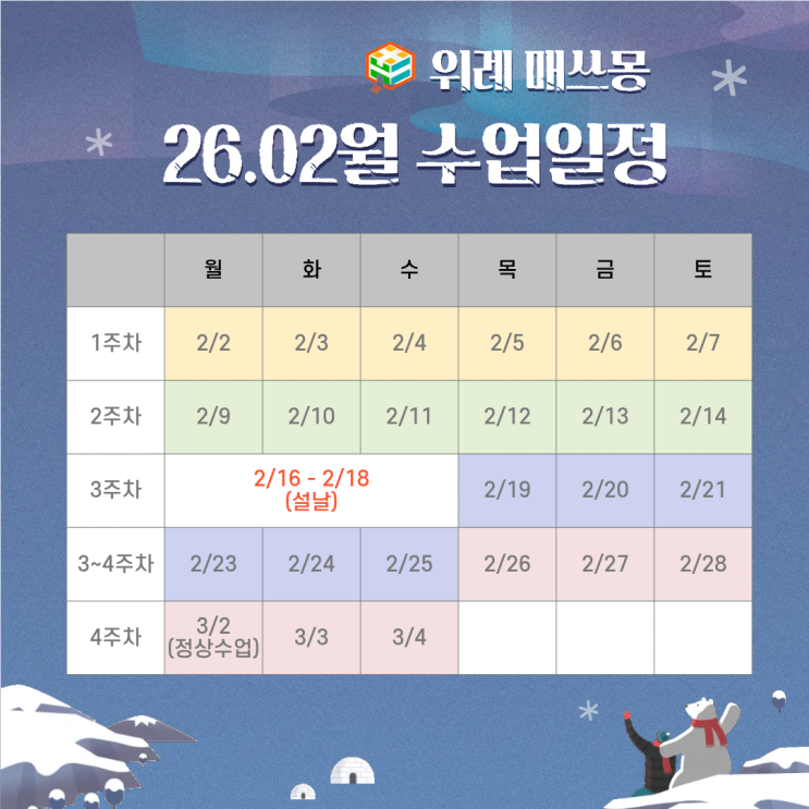 [매쓰몽수학학원 위례캠퍼스] 2026년 2월 수업일정