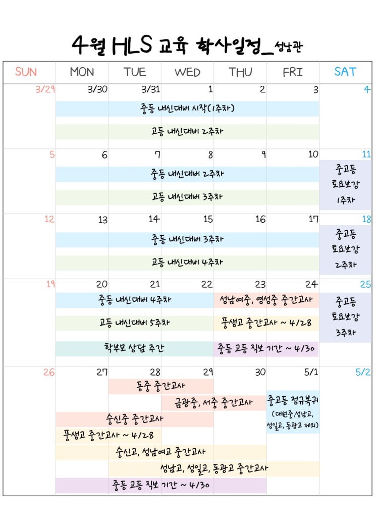 봄바람이 부드럽게 불어오는 4월입니다 [The Way to the BEST] 안녕하세요, 결과를 약속하는 금광동 영어학원 HLS교육 S CLASS입니다 거리마다 벚꽃이 흐드러지게 피어나며 순간의 소중함과 새로운 시작을 이야기하는 계절입니다. 하지만, 학생들에게 벚꽃은 단순한 계절의 의미가 아닙니다. 벚꽃의 꽃말은 ‘중간고사’이기도 합니다. 새로운 학년의 첫 시험인 만큼 HLS는 4월을 가장 중요한 시기로 보고 내신 대비에 모든 초점을 맞춰 운영합니다. 위 일정과 같이 H4월은 전체 기간이 내신 대비 중심으로 운영됩니다. 금광동 영어학원HLS교육 S CLASS 4월 핵심 운영 방향 ✔ 중등 / 고등 내신 대비 집중 기간 ✔ 학부모....... <img src="https://blogthumb.pstatic.net/MjAyNjA0MDFfMTY1/MDAxNzc1MDI2NDg0Mzgz.hCfCfG_JxESuxq_bH9MmjBdVa1CypsCuCckFblb4Hb4g.e5p-KM37hdO-VuyFr7kO-aSK-wmebOtnTB4rwv-H51cg.JPEG/%BC%BA%B3%B2.jpg?type=s3" />