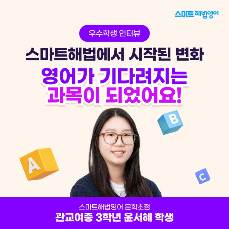첫 영어 학원, 스마트해법영어에서 시작된 변화 “영어가 기다려지는 과목이 되었어요” 윤서혜학생에게 스마트해법영어는 단순한 학원이 아닌, 영어의 진짜 매력을 알게 해준 특별한 배움터입니다. 무작정 외우는 주입식 교육이 아니라, 학습기기를 통한 스마트러닝 학습으로 원리를 이해하고 스스로 묻고 답하는 공부법을 익히며 영어 실력은 물론, 공부에 대한 태도까지 달라졌습니다. 첫 영어 학원, 고민 없이 선택했어요 초등학교 6학년 때 스마트해법영어를 처음 만나 지금까지 3년째 꾸준히 다니고 있습니다. 처음 학원을 선택할 때 고민이 많았는데, “개인 맞춤형으로 꼼꼼하게 지도해준다”는 추천을 듣고 상담을 받게 되었고, 주입식....... <img src="https://blogthumb.pstatic.net/MjAyNjAzMzBfMTgw/MDAxNzc0ODM1MDAyNDgx.FmcNHGSWHZUjaU65lIEOUTQFVmQYmn2kCjE9dc_6M0wg.VOD4O8XiE2S8q60IJp721WNDJkY84HBdlN0DLfWBGigg.JPEG/260121_%BD%BA%B8%B6%C6%AE%C7%D8%B9%FD%BF%B5%BE%EE%BF%EC%BC%F6%C7%D0%BB%FD_01%28%BA%ED%B7%CE%B1%D7%29.jpg?type=s3" />