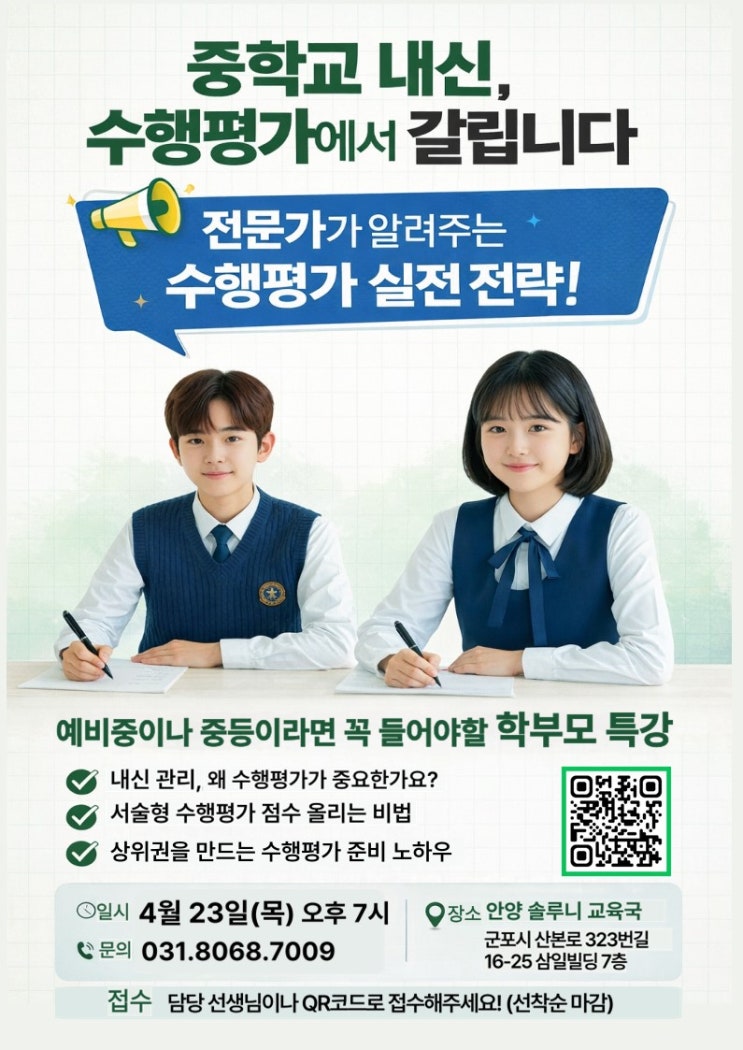 초등학교를 졸업하고 중학교 진학을 앞두거나, 이제 막 중학교 생활을 시작한 우리 아이들. 학부모님들의 가장 큰 고민 중 하나는 단연 '내신 관리'일 텐데요. 특히 최근 중학교 내신의 핵심으로 떠오른 '수행평가'에 대해 막막함을 느끼시는 분들이 많으실 거라 생각합니다. 지필고사 성적만으로 내신을 완성하던 시대는 지났습니다. 이제 중학교 내신의 성패는 수행평가에서 갈립니다! 이에 안양 솔루니 교육국에서는 오랜 현장 지도 노하우를 바탕으로, 학부모님들의 고민을 시원하게 해결해 드릴 특별한 학부모 특강을 준비했습니다. 수행평가 실전 전략 1. 전문가가 알려주는 수행평가 실전 전략! 예비 중학생 및 중학....... <img src="https://blogthumb.pstatic.net/MjAyNjAzMzFfMjAx/MDAxNzc0OTM4OTAzOTg4.S73AtOVeXsnQg5PLTvjXWpDd2B_ALzfFy9Fyah3EYVkg.LndtCSzzcy1AHy14OdzajnueLGrfzha-3bVK2cWzUu4g.JPEG/%BC%D6%B7%E7%B4%CF_%C7%D0%BA%CE%B8%F0%C6%AF%B0%AD.jpg?type=s3" />