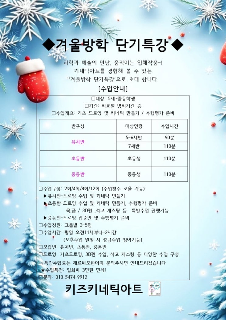 2025년 겨울방학을 맞아, 아이들의 창의력과 예술적 표현을 한층 높일 수 있는 겨울방학 미술특강을 진행합니다. 다양한 미술기법과 체계적인 수업을 통해 아이들이 즐겁게 배우고 스스로 작품을 완성하는 경험을 제공하며 중학교 수행평가 대비까지 함께 준비할 수 있도록 구성했습니다. 이번 겨울, 우리 아이들의 예술적 기능성을 키워주는 소중한 시간을 만나보세요~^^ 키즈키네틱 방학특강을 주변 친구나 학부모님께도 소개 부탁드리며, 자세한 내용이나 궁금하신 사항은 언제든지 문의해 주세요~ (010 5474 9912) . . . . #평촌남아미술 #평촌7세미술 #평촌유아미술 #평촌초등미술 #평촌미술 #평촌학원가 #키즈키네틱아트미술학원 #평촌수행....... <img src="https://blogthumb.pstatic.net/MjAyNTExMjRfMzgg/MDAxNzYzOTkwMTQ5MzY2.-1Lw5TTraDvQ_lkazKmSq02eLE-H1KA_aj_WdRqGZ-cg.W84roGOUhFtTneAI1zlUwp580oRzxdWB7_FYS9kTbi0g.JPEG/900%A3%DF1763989122209.jpg?type=s3" />