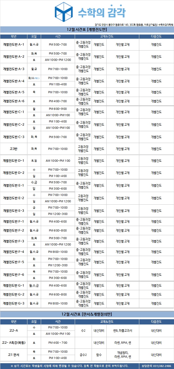 예비고2를 위한 설명회(안양외고) 안양외고반 수업시간 안내(2025년 12월 13일(토) 시작) 기말이 마무리 되었던 지난 토요일부터 대수 수업을 시작했습니다. 물론 공연동아리 행사로 많은 학생들이 결석을 해서 영상을 찍고 공유하는 상황이긴 하지만 빠르게 시작해야 하는 시점이라 우선 시작했으니 참여치 못한 학생들은 "대수 지식의 힘(윈터)"교재를 받아서 공부를 시작하고 다음 수업을 준비해주세요. *12월은 대수를 시작합니다. 1월과 2월은 대수 특강 또는 미적분1특강을 선택할 수 있도록 계획하고 있습니다. 2025년 2학기 기말 기출분석 안양외고1 공수2 명제~무리함수 교과서 및 단원별 문항분석 모든 문항이 부교재와 교과....... <img src="https://blogthumb.pstatic.net/MjAyNTEyMTZfMiAg/MDAxNzY1ODY1Mzg3NzMy.oswqXHde1YgHnTWe61UOJiwZQc9MvFUlIt0oVXus2Vkg.ONxiAz-AG3h91ToETl7HjIMByqT_Arhv781hypo81XMg.JPEG/%BE%C8%BE%E7%BF%DC%B0%ED_%B0%F8%BC%F62.jpg?type=s3" />