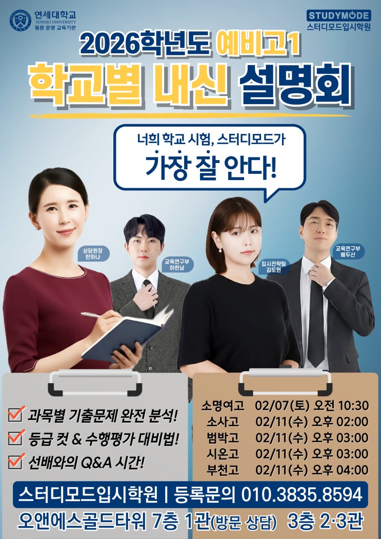 고등학교에 당당히 입성하는 예비고1 학생들을 위해 2026 스터디모드 학교별 내신 설명회를 개최합니다. 본원 재원생들만을 위한 특별한 기회, 대입과 직결되는 고교 첫 학기부터 완벽하게 대비합니다! 학교별 설명회 일정 설명회 주요 내용 첫째, 주요 과목별 지필평가 기출문제를 분석합니다. 둘째, 주요 과목별 예상 등급 컷과 수행평가 대비법을 공개합니다. 셋째, 선배와의 Q&A 시간을 통해 우리 학교에 대한 궁금증을 모두 해결합니다. 신청 방법 02/03(화)부터 각 반별 배부된 신청서 URL를 통해 빠르게 신청해주세요. 선착순 마감됩니다! 연세대학교 동문 운영 교육기관 스터디모드입시학원 등록 문의 / 상담 예약 010-3835-8594 부....... <img src="https://blogthumb.pstatic.net/MjAyNjAyMDNfMjEw/MDAxNzcwMTIxODQzMjQ2.2p5Sg77Ou67VWS1gttn1i9jRv5Vljbt_MjjyB6x6tfkg.yoLne6CKq_tkMip_kagwQtbaHqOnP56ZHFEwmTL2ldcg.JPEG/%C0%FC%B4%DC%C1%F6_2026%C7%D0%B3%E2%B5%B5_%BF%B9%BA%F1%B0%ED1_%C7%D0%B1%B3%BA%B0_%B3%BB%BD%C5_%BC%B3%B8%ED%C8%B8.jpg?type=s3" />