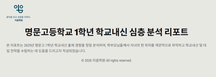 2025년 명문고등학교 1학년 내신에서 4등급을 받던 학생이 이음학원에서 2등급으로 단번에 뛰어 오를 수 있었던 비결! 이음학원에서 준비한 심층분석 설명회에서 명문고등학교 내신을 사로잡을 비법을 단 하루만 공개합니다! https://m.site.naver.com/203JB <img src="https://blogthumb.pstatic.net/MjAyNjAyMDNfMTMx/MDAxNzcwMTAyMjkxNDAw.y0nepPqAqnBB9DfTgUEjA_LJupeCThpNRZMkXIZvOncg.9KNbUDsmvD77iH-ZKCej3lttF0EPnxhhVoJEaahHGQEg.PNG/KakaoTalk_20260128_145001437.png?type=s3" />