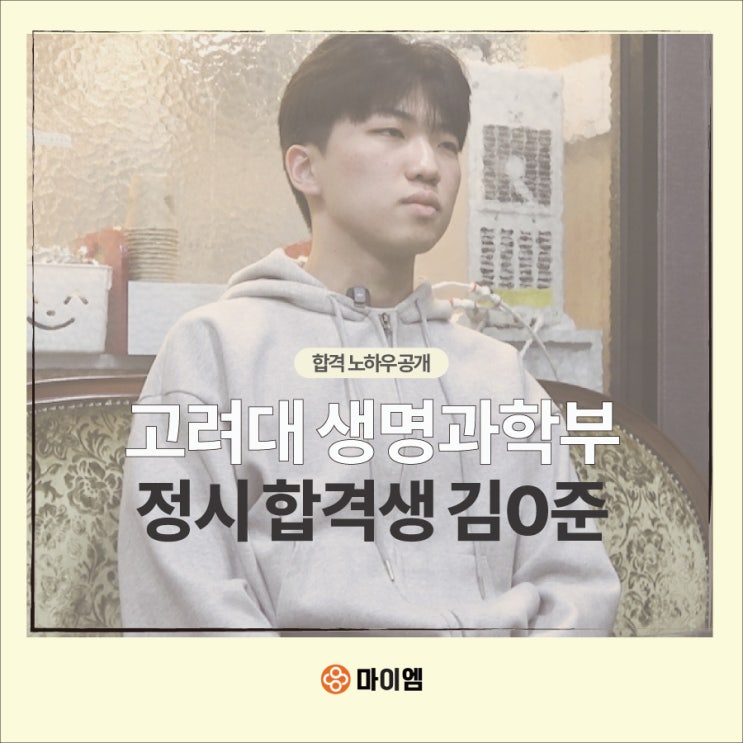 고려대학교 생명과학부 정시전형 합격생 김민준 (진성고,마이엠 재학생) "열심히"보다 중요한 것은 "어떻게"입니다 : 정시 파이터의 5가지 반전 전략 무조건 책상 앞에 오래 앉아 있는 것만이 정답일까요? 많은 수험생이 '절대 공부 시간'에 집착하지만, 안타깝게도 노력과 성적이 비례하지 않는 경우를 자주 목격합니다. 진성고등학교를 졸업하고 고려대학교 생명과학부에 합격한 김민준 학생의 사례는 우리에게 중요한 화두를 던집니다. 그는 단순히 시간을 견뎌내는 공부가 아닌, 뇌의 리듬과 시험 현장을 철저히 동기화하는 '전략적 접근'으로 합격의 문을 열었습니다. 정시 파이터로서 그가 치열하....... <img src="https://blogthumb.pstatic.net/MjAyNjAyMDNfMjQg/MDAxNzcwMTA4NzQyNDEw.Wmb4APJZ1fnn2cqLLvp5rJIXp2WGLqCR3GIBiOYAB8wg.RAMOYW-p3IQtHXbY_WBOuJO0nQ9u-olWiwqRZgoxYGwg.JPEG/%B0%ED%B7%C1%B4%EB%C7%D5%B0%DD.jpg?type=s3" />