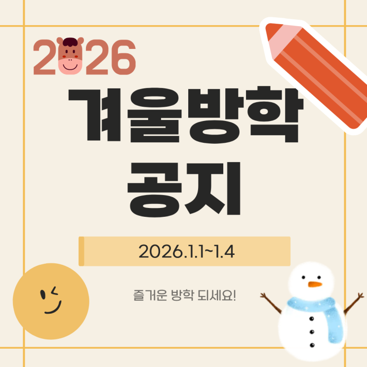 다가오는 새해를 맞아 겨울방학 일정을 안내드립니다. 휴강 기간 ▶ 1월 1일(수) ~ 1월 4일(토) ※ 1월 2일(목) 휴강으로 인해 해당 기간을 방학으로 운영합니다. 수업은 1월 6일(월)부터 정상적으로 재개됩니다. 짧은 방학 기간 동안 충분히 휴식하며 새해 학습 계획도 차분히 정리하는 시간이 되길 바랍니다. 새해에도 학생들의 성장을 위해 최선을 다하는 매쓰코디수학이 되겠습니다. <img src="https://blogthumb.pstatic.net/MjAyNTEyMjdfMTI4/MDAxNzY2ODQ0NjQ3NTAy.z4kdI2DCjxH1_BpBEeM0PR1A1qLJcOaRBWaJtb4CPMYg.DWnPZYd9hmNOSY3PfCG79vxVIV8z_aST4JSZektLOPsg.PNG/%C1%A6%B8%F1%C0%BB_%C0%D4%B7%C2%C7%D8%C1%D6%BC%BC%BF%E4.png?type=s3" />