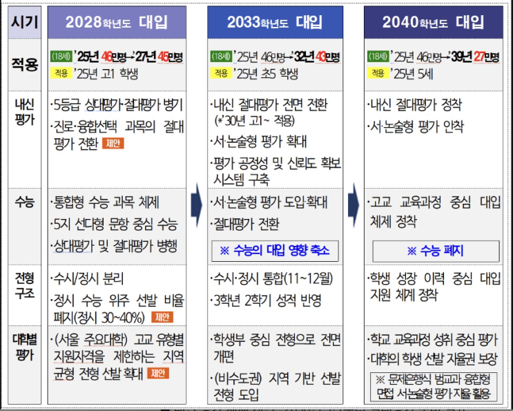 “수능 이후의 시대, 우리 아이 교육은 어디로 가고 있을까요?” 요즘 학부모님들께서 가장 많이 하시는 질문 중 하나가 있습니다. “앞으로 입시는 어떻게 바뀌나요?” 그리고 그 질문의 중심에는 늘 수능이 있습니다. 최근 언론을 통해 소개된 대입 제도 개편 논의는 이 질문에 대해 한 가지 분명한 방향을 보여주고 있습니다. 지금의 논의는 ‘갑작스러운 변화’가 아니라, 교육이 어떤 방향으로 이동하고 있는지를 보여주는 신호라는 점입니다. ✔️ 지금 이야기되고 있는 변화의 큰 흐름 최근 제안된 내용을 정리해 보면, 방향은 비교적 명확합니다. 수능 중심 선발의 비중을 점차 줄이고 내신은 상대평가에서 절대평가로 이동하며 단답형 문....... <img src="https://blogthumb.pstatic.net/MjAyNTEyMTVfMzUg/MDAxNzY1ODA0NDY4MDE4.j3XIL45Nmf79g20b5sNjaaODa88mRsQL97qOSI8EymIg.kpQVWCfGqS1hBhTy-iLTzfJvCPKjaiXIYIyU_KHJlqgg.PNG/%BD%BA%C5%A9%B8%B0%BC%A6_2025-12-15_221321.png?type=s3" />