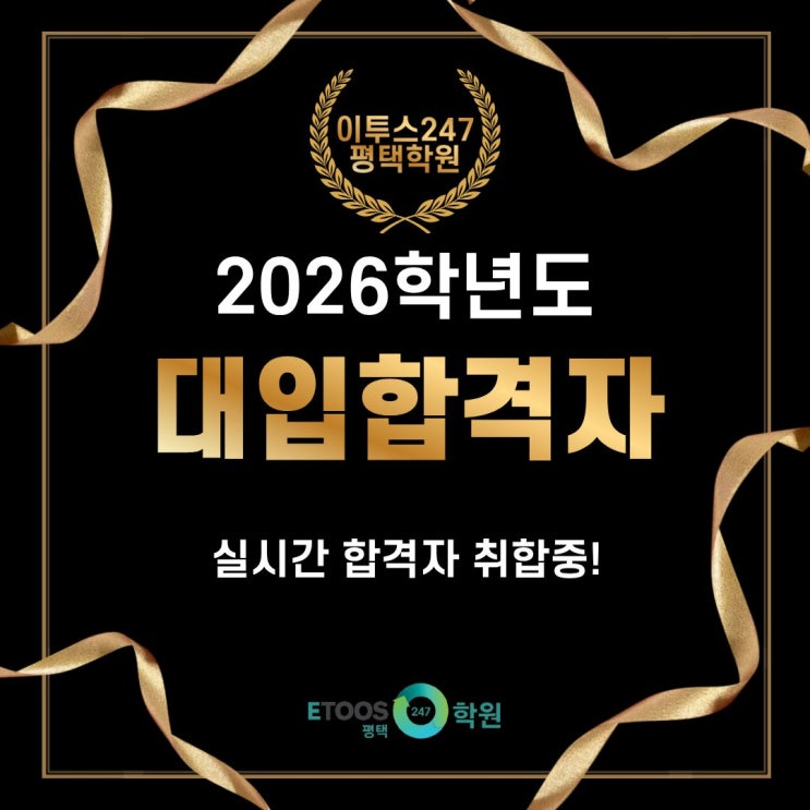 안녕하세요. 이투스247평택학원입니다. 올해에도 어김없이 들려오는 행복한 소식! 바로 2026학년도 대입 합격 소식입니다~! 수시 합격자가 발표되고 이투스247평택학원 졸업생들의 좋은 소식들이 들려오고 있습니다. 실시간으로 합격자가 업데이트되니 많은 관심 부탁드립니다. 이투스247평택학원 졸업생들의 값진 결과 함께 보시죠! 그동안 고생한 졸업생들에게 뜨거운 박수를 보내며 모두 합격을 축하합니다~! #평택독학재수학원 #평택재수학원 #평택학원 #평택관리형독서실 #평택이투스 #이투스평택 #이투스247학원평택 #평택독학재수 #평택재수 #송탄재수학원 #안성재수학원 #평택고덕재수학원 #2027수능 #2027재수 #2027학년도수능 #2027학....... <img src="https://blogthumb.pstatic.net/MjAyNTEyMTlfMjk4/MDAxNzY2MTIwMTM3ODM3.zhoVHUJpn7HkEc055rI5iwKhviocnQlSlUquyWGtaH0g.8-tE5_jx5EVCv3KGTjAidqa0H3gCiJ0pddTnCX4w0Ykg.JPEG/%C1%A6%B8%F1%C0%BB_%C0%D4%B7%C2%C7%D8%C1%D6%BC%BC%BF%E4..jpg?type=s3" />