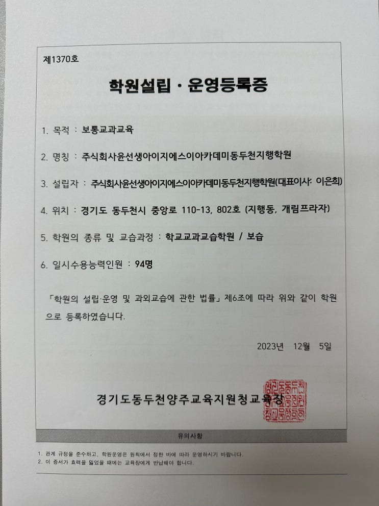 1. 설립운영 등록증명서 우리 학원은 경기도 동두천양주교육지원청에 정식 등록된 기관입니다. 모든 운영은 교육지원청 지침을 준수하여 이루어지며, 학생들에게 안전하고 효과적인 교육 환경을 제공합니다. 2. 교습비 게시 모든 교습비는 교육지원청에 신고된 금액으로 운영됩니다. 학부모님께서는 아래의 교습비 정보를 참고해 주세요. 3. 환불 규정 안내 우리 원은 교육청의 환불 규정을 준수합니다. 수강 취소 시 아래 기준에 따라 환불이 진행됩니다. 개강 전: 전액 환불 개강 후: 경과된 기간을 제외한 금액 환불 <img src="https://blogthumb.pstatic.net/MjAyNjA0MDNfNjMg/MDAxNzc1MTkzMDA2NzUx.Ppoggv0dJTHej2Hwi3Jpbzu79P41jGmoPia9YjEqxYUg.V8TezfwPmk-DM5eVB0V3xRoOn59dsUuxiUEeEJhfO5Ug.JPEG/KakaoTalk_20260403_135236940.jpg?type=s3" />