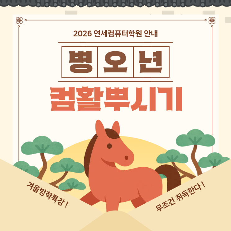 안녕하세요, 여러분! 연세컴퓨터학원입니다 어느덧 차가운 겨울바람 끝에 설레는 2월 설 명절이 다가왔습니다~! 2026년 새해를 맞이하며 다짐했던 계획들, 잘 실천하고 계신가요? 이번 설 명절에는 사랑하는 가족들과 맛있는 음식도 드시고, 그동안 바빠서 챙기지 못했던 나만의 시간을 가지며 '쉼'과 '성장'을 동시에 챙기는 뜻깊은 연휴 보내시길 바랍니다 새해 복 많이 받으세요! ♂️♀️ 오늘은 설 연휴 이후, 본격적으로 나만의 경쟁력을 쌓고 싶어 하는 분들을 위해 '컴퓨터활용능력(1급/2급)' 자격증에 대해 이야기해보려 합니다 왜 '컴퓨터활용능력'일까요? 지금 바로 따야....... <img src="https://blogthumb.pstatic.net/MjAyNjAyMDVfNzYg/MDAxNzcwMjgxMjQwODIx.4IUfR1Z5ps6Ck8hydjSoEGwgTPyHNYyuXlBxQOjLV60g._x_kKdF6rRGdhDQneMafs2_HIw-ck2CUPQYOUWu0Ot0g.PNG/1.png?type=s3" />